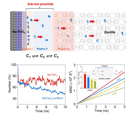 为了深入理解这个过程,研究人员进行了理论模拟进一步了解烯烃分子在Na-FeCx表面的吸附和扩散行为。通过分子动力学模拟发现分子筛的存在使得烯烃分子的解吸-再吸附平衡发生了改变,拉动反应的正向进行。均方位移(MSD)的斜率值定量测定了乙烯分子在不同层数的分子筛晶体中的扩散系数(Ds)。结果表明分子筛晶体越薄,烯烃分子在分子筛孔道中停留时间越短,越有利于连续快速地转移烯烃分子,从而提高反应活性,形成更多的烯烃产物。