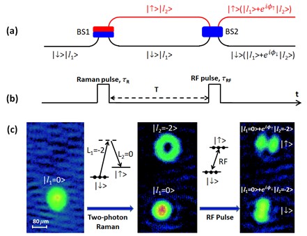 在前期工作的基础上,研究团队利用偏置磁场在铷87原子F=1超精细能级的三个磁子能级间产生较大的二阶塞曼频移。团队利用一对具有不同角动量的拉曼光束诱导双光子跃迁,获得干涉仪的第一个分束器,干涉仪的两臂具有不同的自旋和角动量(涡旋态);随后利用射频脉冲作为第二个分束器,在两个自旋态(对应分束器的两个输出端口)上都实现涡旋物质波的干涉。通过选择合适的拉曼光和射频脉冲的失谐量,确保原子只布居在两个磁子能级,产生无损耗的分束器。不同于线动量干涉产生的线向干涉条纹,实验上观察到角向干涉条纹。通过对干涉图样的分析,发现两自旋态上的干条纹具有反相位关系(π 相位差),该相位关系不受两涡旋态的角动量差、拉曼光的组成和超冷原子自由膨胀时间等实验参数的影响。提出了利用涡旋物质波干涉仪测量磁场的方案,并对磁场测量的灵敏度进行了评估,指出该方案可以测量有限大小的磁场,并且测量灵敏度不受原子数波动的影响。该工作为构建基于涡旋物质波干涉的新型量子传感器提供了实验基础。
