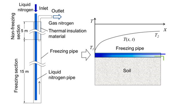 (2)考虑冷量损耗的富水砂卵石地层冻结壁增长机制。基于砂卵石地层盾构接收井垂直液氮冻结工程,研究了LN2冻结过程中的热传导方程,揭示了考虑冷量损耗的砂卵石地层冻结壁增长机制,建立三维计算模型研究了冻结壁增长规律和冻结优化方法,并与监测结果进行了对比分析。