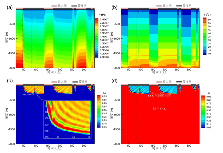 图2 工程运行期间注入井内(a)压力(b)温度(c)气相CO2饱和度(d)液相或超临界CO2饱和度随时间变化等值云图