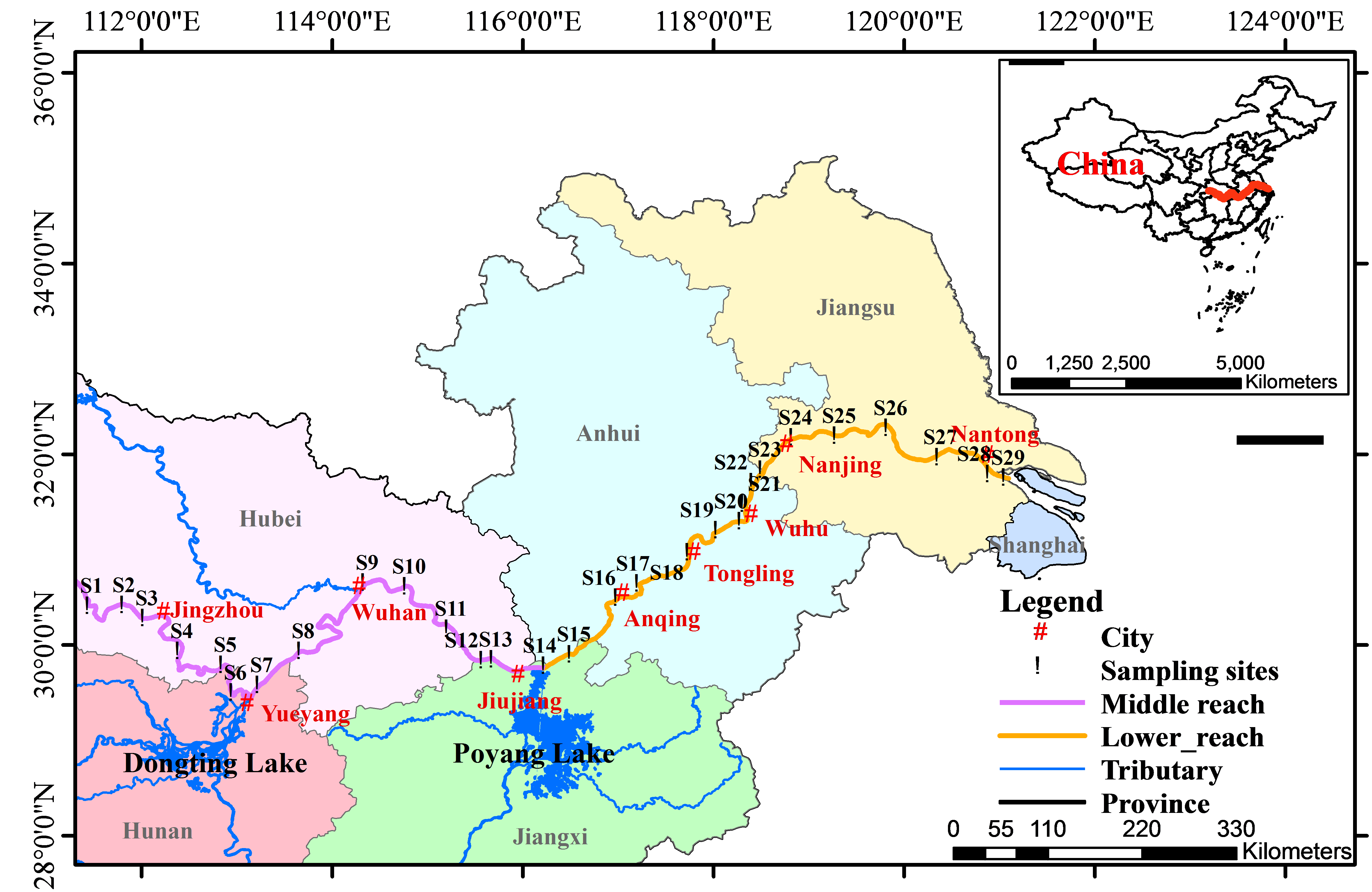 图2 长江中下游研究区域及各采样点的空间分布示意图
