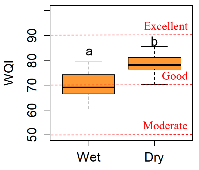 研究发现,丰水期长江中下游干流水体中的总磷(TP)、化学需氧量(COD)、总悬浮物(TSS)和浊度(TUR)的浓度显著高于枯水期(图3)。丰水期和枯水期的水质综合指数WQI等级分别为“中等”和“良好”(图4)。