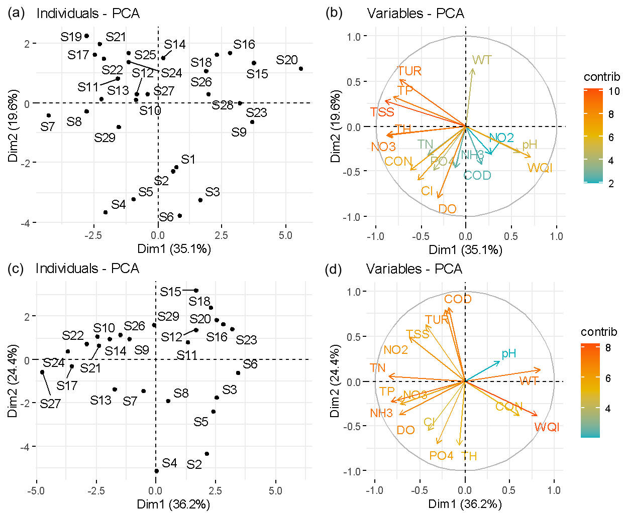 与其它采样点相比,长江中下游干流靠近三峡大坝的采样点丰、枯水期两季的总磷(TP)、总氮(TP)、总悬浮物(TSS)和浊度(TUR)均较低(图5)。此外,这些采样点在丰水期的水温相对较低,而在枯水期的水温相对较高(图5)。
