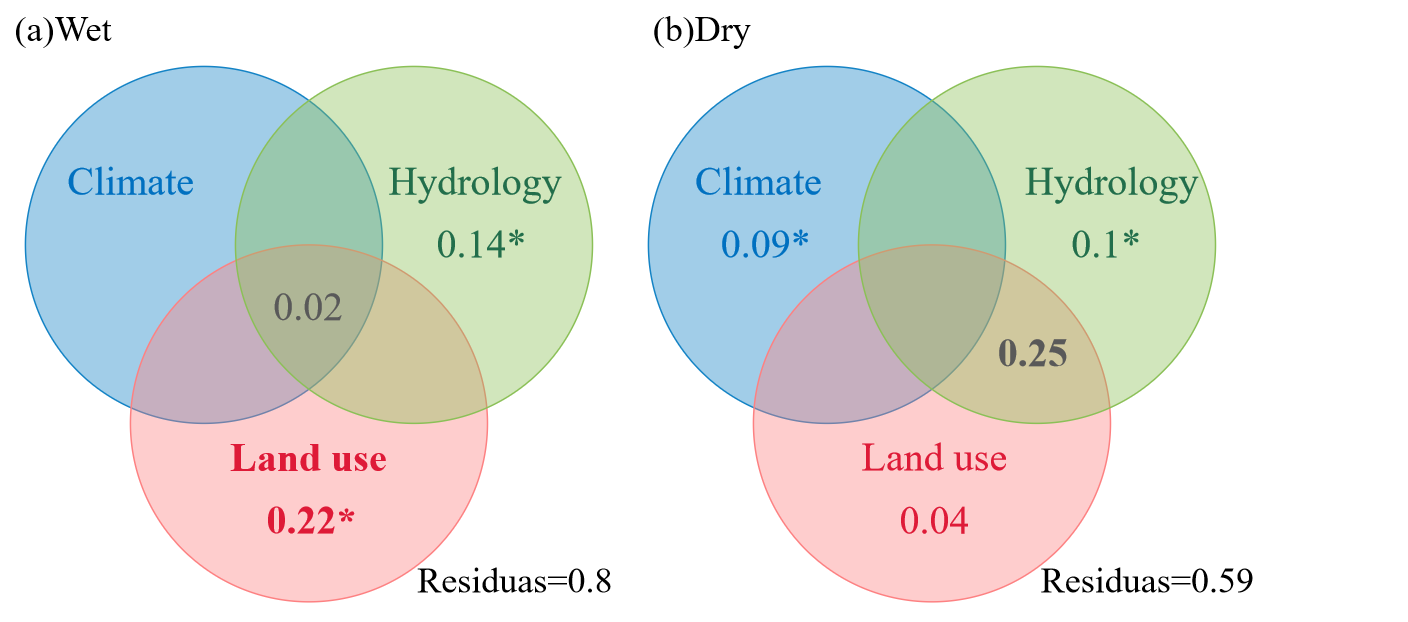 在丰水期,长江中下游干流水质的空间格局主要受岸带土地利用因素的影响,而枯水期则以土地利用与水文因子的共同作用为主(图6)。