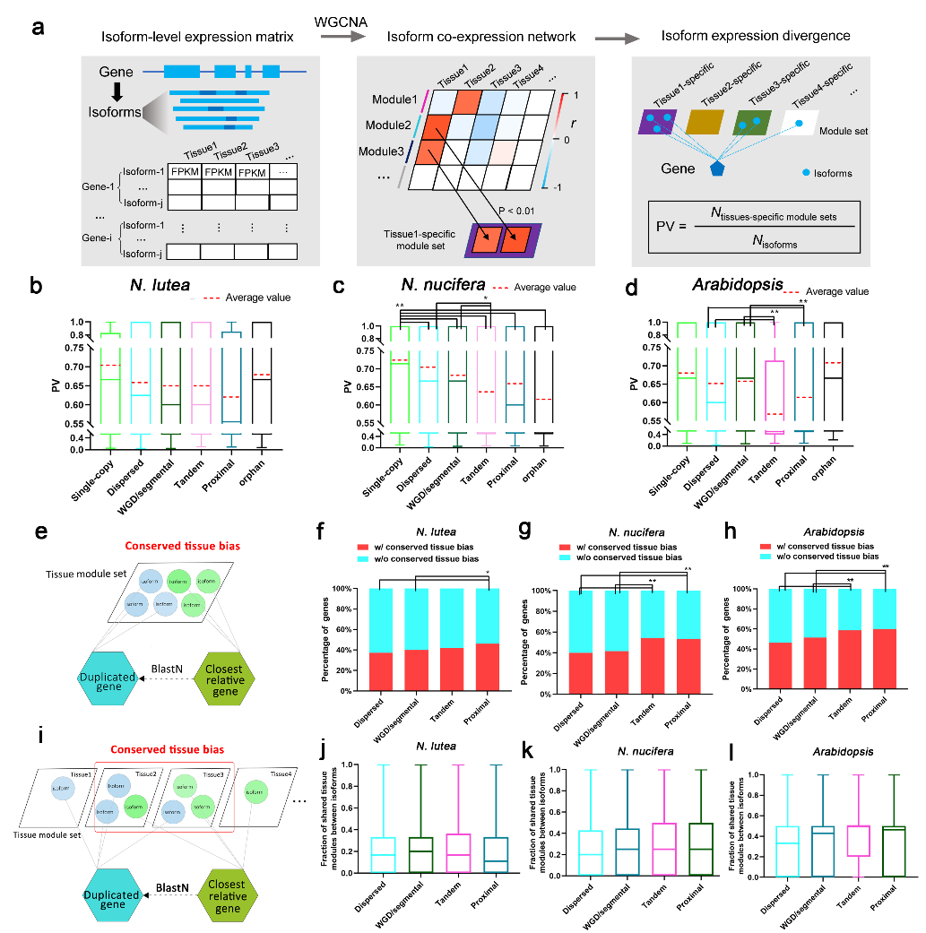 针对上述问题,武汉植物园与比利时根特大学合作,以莲属植物现存的两个近缘种(莲(Nelumbo nucifera)和美洲黄莲(N. lutea)为研究对象,模式植物拟南芥为外类群,利用三代全长转录组测序技术开展相关研究。结果表明可变剪切事件在种间直系同源基因间大量分化,受物种特异性可变剪切调控形成的异构体促进莲属物种分化进程中基因功能的改变。相比于有多拷贝的复制基因,单拷贝、低拷贝基因发生更多的可变剪切事件,产生更多的异构体并且展现出更加复杂的组织表达模式。进一步通过物种间转录本水平共表达网络的比较分析,发现直系同源基因间的部分异构体拥有保守的组织表达偏向性,表明物种进化过程中基因功能的保守性可能与其可变剪切异构体的组织表达模式相关。此外,该研究还发现了花器官发育的‘ABCE模型’相关的MADS-box家族个别成员在拟南芥与两种莲之间存在mRNA异构体组织表达模式的分化,进而可能参与了种间花器官的性状分化。