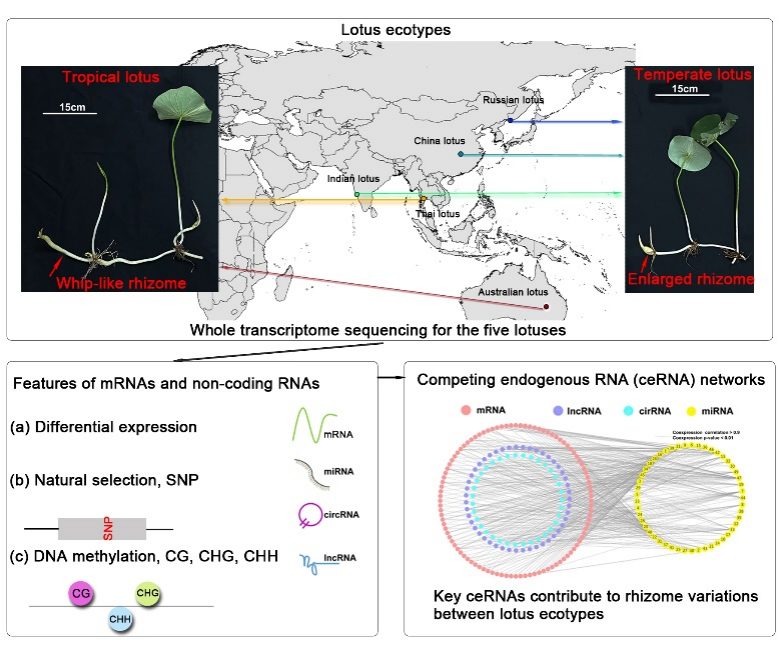 非编码RNA包括lncRNA、miRNA和circRNA等,它们在植物基因表达调控网络中起着重要的作用。然而目前鲜有对其在水生开花植物表型适应性进化中的作用的研究。莲(Nelumbo nucifera)在对不同纬度地区环境的适应性进化过程中产生两种表型差异的生态型:地下茎膨大越冬并具有明显年生长发育周期的温带莲,地下茎呈鞭状不膨大且全年无明显停顿生长的热带莲。武汉植物园陈进明研究团队与武汉园林科学研究院合作,以莲两生态型的地下茎为研究对象,利用全转录组测序技术解析非编码RNA在莲地下茎表型分化的基因表达调控网络中的作用,对物种适应性进化及生态型间差异表型形成的分子机制研究提供重要参考。