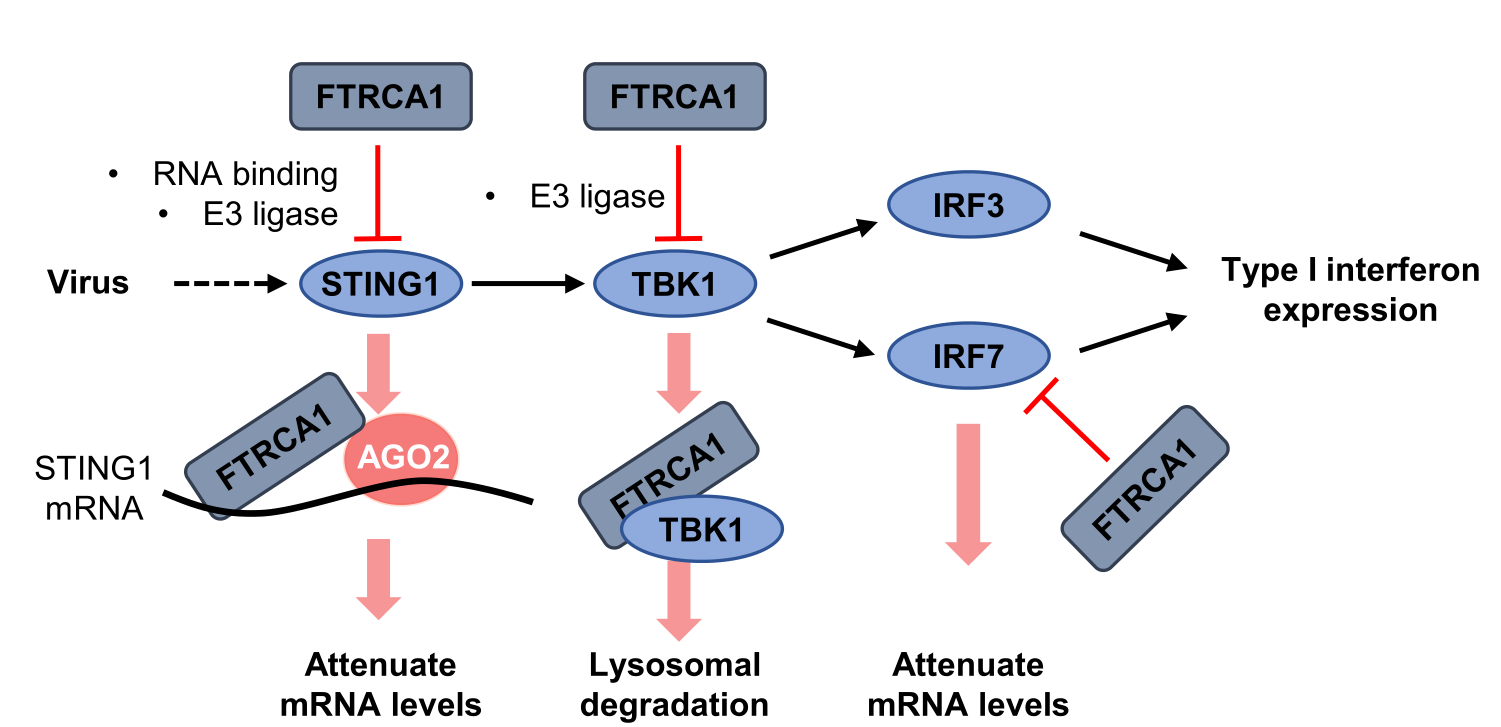最近,团队研究结果证明:FTRCA1不仅是一个E3泛素连接酶,而且是一个RNA结合蛋白。其负调控宿主干扰素抗病毒反应的机制是:在病毒感染的细胞中,FTRCA1选择性地与信号分子STING(也称为MITA)和IRF7的mRNA结合,通过RISC(RNA-induced silencing complex)途径降解mRNA负调控干扰素反应;此外,FTRCA1蛋白还直接结合TBK1蛋白,通过溶酶体途径降解TBK1蛋白负调控干扰素反应(J Immunol 2022;209:1335-1347)。团队的研究结果解释了一个物种特异的finTRIM蛋白,如何同时获得RNA结合活性和E3泛素连接酶活性,从RNA水平和蛋白水平两个层面调控宿主干扰素抗病毒反应的分子机制(图1)。