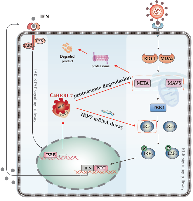 图2:鲫HERC7在蛋白水平和mRNA水平靶向RLR信号通路分子调控鲫干扰素抗病毒免疫反应