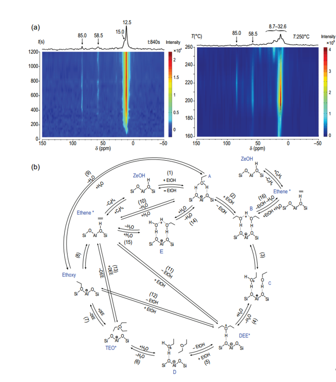 利用原位13C固体核磁共振技术对H-ZSM-5分子筛上乙醇脱水反应在线观测,以及基于实验结果提出的乙醇脱水制乙烯反应机制