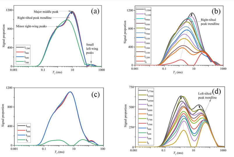 图1 AFO (a),TEO (b),TEC (c),OEO (d)边界条件下,岩心自吸过程中的流体T2谱特征:AFO,TEC和TEO边界条件的岩心,自吸过程中流体流动趋于大孔隙;而在OEO边界条件下,流体流动趋于小孔隙。
