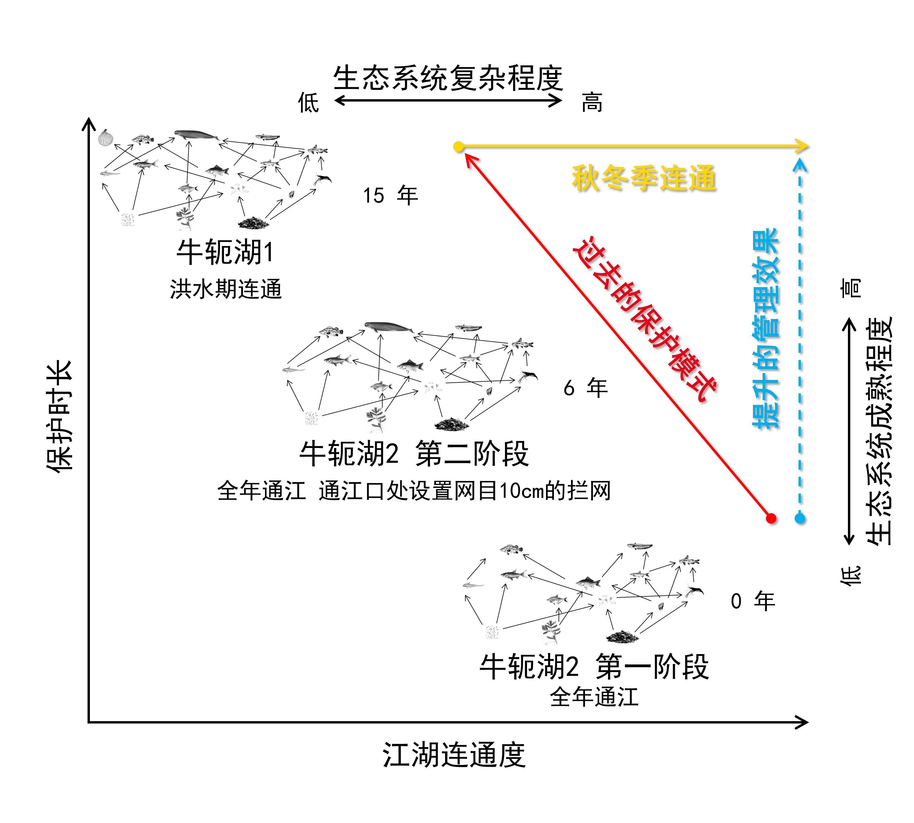 江湖阻隔与过度捕捞等人类活动是江湖复合系统生态安全保障面临的最大威胁。基于防洪、生物多样性及水环境保护等目标,长江中下游闸控湖泊长期采取了季节性连通的恢复策略(灌江纳苗等)。而自2020年1月起,长江及其附属湖泊又实施了为期十年的禁渔计划。湖泊生态系统结构和功能如何响应这些宏观保护和修复管理措施的定量研究相对缺乏。