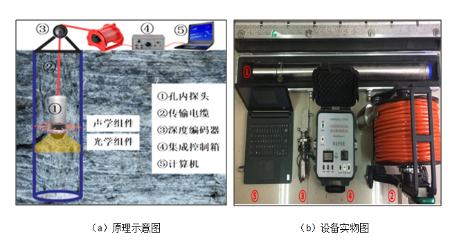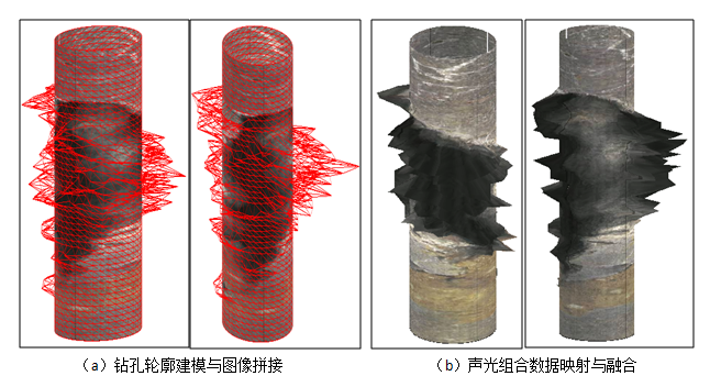 针对这一问题,中国科学院武汉岩土力学研究所数字钻孔摄像技术组科研人员提出了一种钻孔孔壁声光组合式测量方法,通过钻孔声波扫描与钻孔光学影像同步采集并相互融合的解决思路,研发了基于钻孔声光组合式测量的岩体结构探测设备,实现了孔壁声学反射特性与光学影像特征的各自优势互为补充和互相印证,从而提高了岩体结构数据解译和判读的准确性和客观性。该方法以全方位声波脉冲反射序列数据和前视光学钻孔图像为主要数据来源,在考虑钻孔声学响应特征、几何轮廓特征、光学纹理特征、结构完整特征的基础上,建立了声光组合测量数据之间的映射关系与融合机制,形成了基于全脉冲声波扫描数据与钻孔前视光学图像的钻孔岩体结构三维建模与数据可视化方法,从而实现了融合钻孔周向和轴向的钻孔孔壁三维可视化过程,有助于钻孔各种演化阶段下的定性与定量描述,为钻孔岩体结构识别与分类提供更多有效数据支撑。