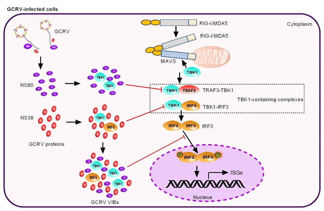 中国科学院水生生物研究所昌鸣先研究团队以GCRV为研究模型,揭示了GCRV非结构蛋白NS80和NS38通过靶向视黄酸诱导基因-I样受体所介导的抗病毒信号通路逃逸宿主抗病毒免疫反应的分子机制(图 1)。研究发现,NS80通过与TBK1和TRAF3的互作减少TBK1-TRAF3功能复合体的形成;而NS38通过与TBK1和IRF3的互作减少TBK1-IRF3功能复合体的形成。此外,NS80和NS38能诱骗TBK1和IRF3进入位于胞浆的病毒包涵体,进而减少IRF3的入核。而核内IRF3的减少抑制了干扰素和干扰素诱导蛋白的产生,从而逃逸了宿主抗病毒免疫反应。相关结果已在线发表于免疫学经典期刊Journal of Immunology (2022; 208:707-719)(https://doi.org/10.4049/jimmunol.2100723).