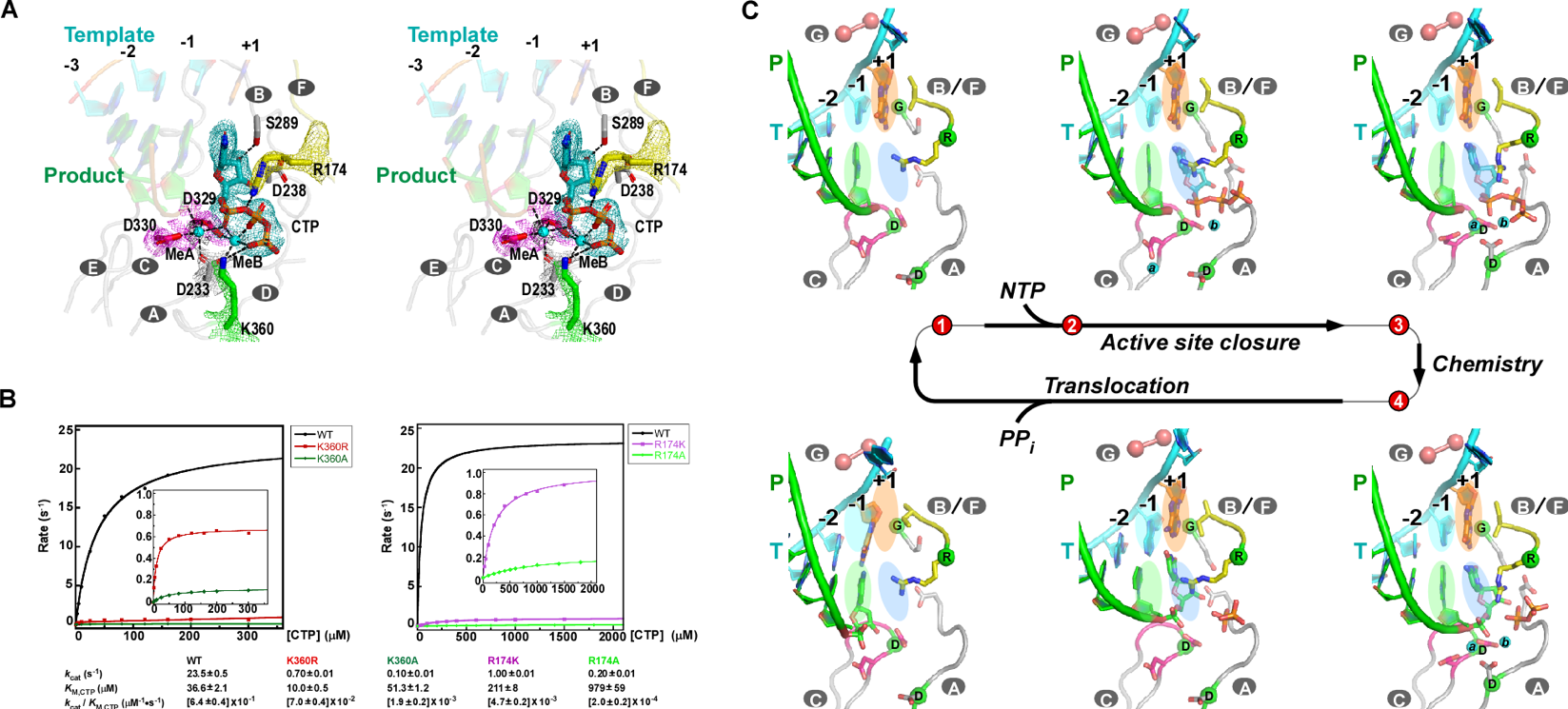 图:病毒RdRP核苷酸添加循环新机制。A)接近催化反应发生状态的EV71 RdRP晶体结构立体对像图。B)K360和R174位点的突变大幅降低RdRP催化效率。C)病毒RdRP核苷酸添加循环(NAC)的完整结构基础,图中参考状态1-4之间的转换过程1-2、2-3、3-4和4-1分别对应NAC步骤1、2、3和4。A和C中的RdRP基序用白色大写字母标注。