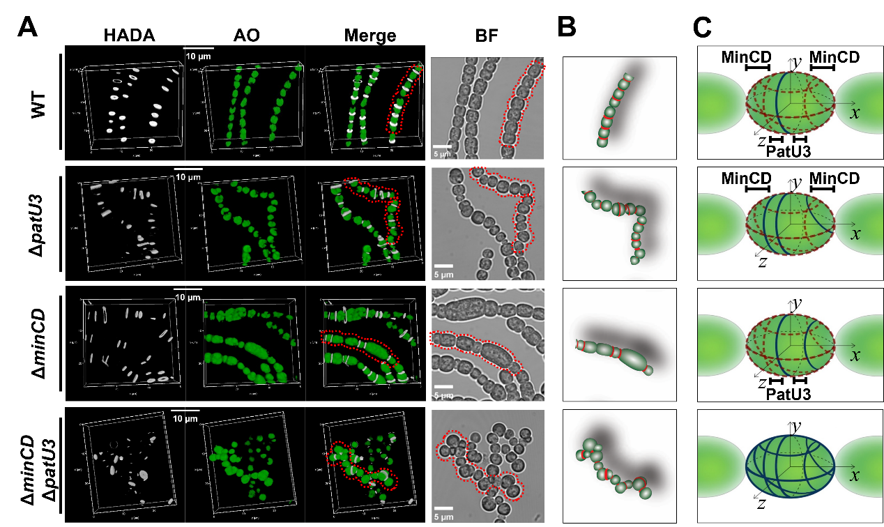 图1:Anabaena细胞分裂位点定位的三维调控。(A)不同菌株的HADA(7-hydroxycoumarin-amino-D-alanine)染色,标识分裂板,白色),和AO染色(acridine orange,标识DNA,绿色)的共聚焦显微图像,及A和B的叠加(merge)。比例尺如图所示。(B) 图A的代表性菌丝示意图(用红色虚线框出),红色实线表示分裂平面。(C)PatU3和Min在Anabaena的细胞分裂位点定位的三维控制的模型。x、y 和 z表示细胞的三个维度。红色虚线代表潜在的细胞分裂位点,极性位点被Min系统抑制以及靠近细胞中心的位点被PatU3抑制。蓝色实线代表细胞分裂过程中实际能够发生的分裂平面。