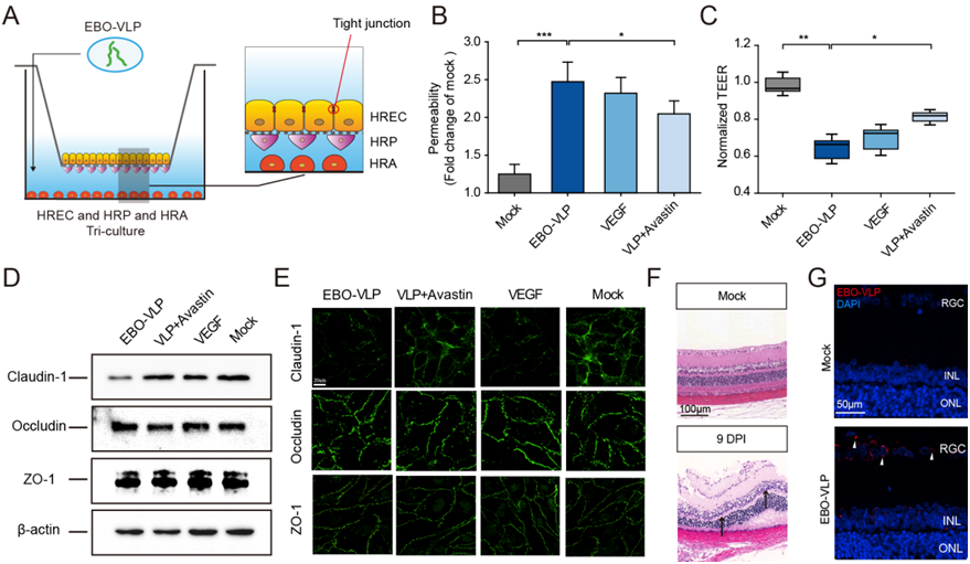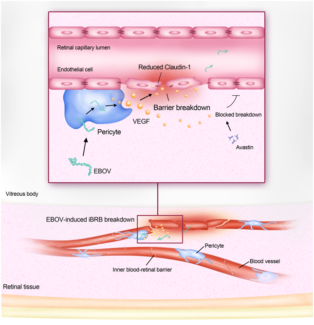本研究中,研究团队构建了多种视网膜细胞共培养的内血-视网膜屏障(inner blood-retinal barrier, iBRB)模型,通过对屏障的电阻测定和渗透性实验,发现丝状埃博拉病毒样颗粒(Ebola virus-like particle, EBO-VLP)会造成内血-视网膜屏障的破坏。但是,埃博拉病毒样颗粒并不是直接对构成屏障的视网膜内皮细胞造成损伤来破坏屏障。之后科研人员通过细胞因子抗体矩阵筛选,发现埃博拉病毒样颗粒可刺激周细胞分泌血管内皮生长因子,VEGF会破坏内血-视网膜屏障的完整性。当加入针对VEGF的抗体(Avastin)后,可阻碍埃博拉病毒样颗粒对血-视网膜屏障的破坏。而且,研究人员发现埃博拉病毒样颗粒刺激周细胞产生的VEGF,下调视网膜内皮细胞紧密连接蛋白claudin-1的表达,从而导致血-视网膜屏障的破坏。其中,埃博拉病毒的表面糖蛋白在病毒破坏内血-视网膜屏障中起关键作用。