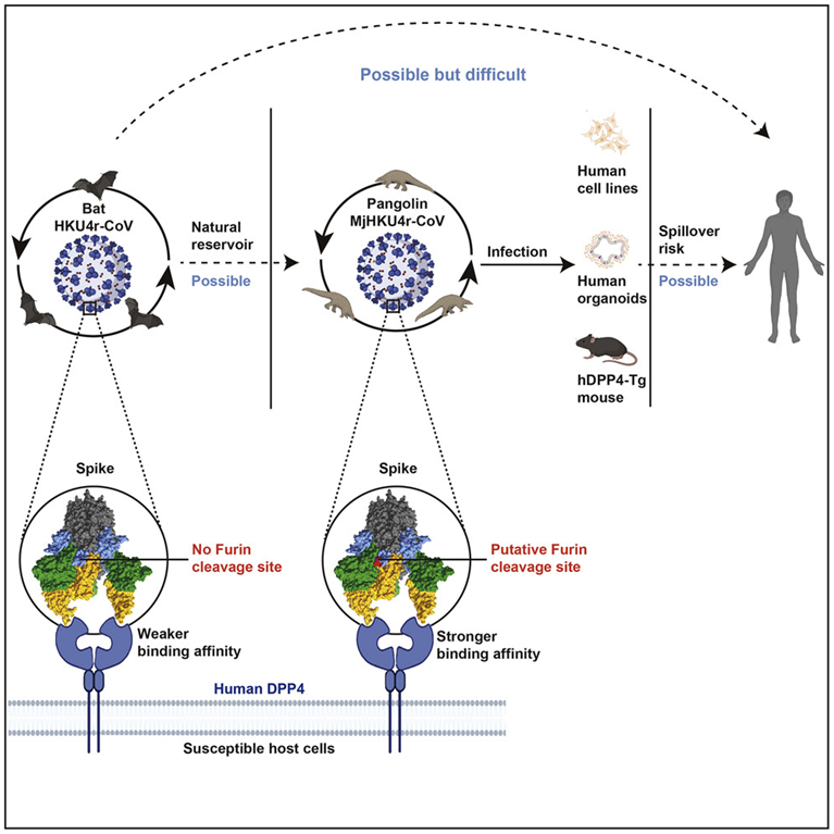 研究团队对MjHKU4r-CoV-1的受体结合等生物学特性进行了解析。证实MjHKU4r-CoV-1与MERS冠状病毒类似,可高效利用人DPP4受体入侵细胞,且与人DPP4受体的结合能力要强于蝙蝠HKU4冠状病毒。研究团队还证实MjHKU4r-CoV-1的S蛋白上具有一处蝙蝠HKU4冠状病毒所不具备的弗林酶切位点,导致MjHKU4r-CoV-1可以被人源细胞的宿主蛋白酶切割,使其能更好地适应人源细胞的入侵。该发现证明冠状病毒感染性增强的弗林酶切位点完全可能由自然界进化而产生。此外,该研究测试了MjHKU4r-CoV-1对不同宿主来源的DPP4受体的亲和力和利用效率,结果表明MjHKU4r-CoV-1可能具有较广的宿主范围。