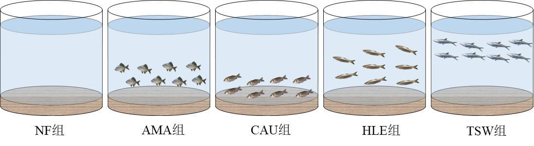 图1 实验设计示意图(NF组:无鱼类放养;AMA组:放养大鳍鱊;CAU组:放养鲫;HLE组:放养?;TSW组:放养似鱎)