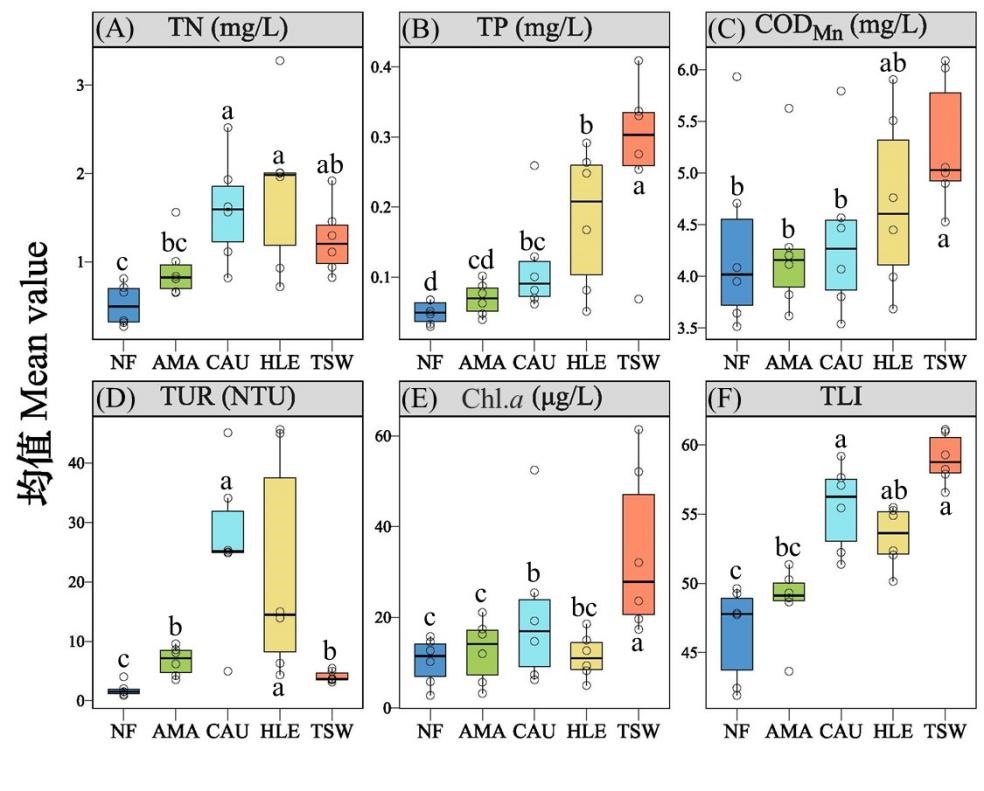图2 实验期间各处理组主要水质指标的均值变化(TN:总氮;TP:总磷;CODMn:高锰酸盐指数;TUR:浊度;Chl.a:叶绿素a;TLI:综合营养状态指数)