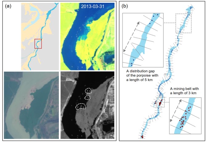 图1 通过遥感影像解译洞庭湖采砂活动的空间分布。(a)采砂船的识别过程(b)示例:2006年长江江豚分布(蓝点)和与该调查相对应时段的采砂船(红点)的空间重叠