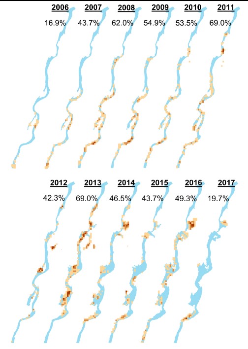 洞庭湖是中国最主要的采砂区之一,2011年仅岳阳市的采砂量就约为3亿吨,这一数字相当于同年美国砂产量的38%。水生所研究表明,洞庭湖的采砂活动呈现出一致的、广泛的扰动。从2007年开始,采砂的范围和强度均持续增加;2008年至2016年是采砂密集期,开采强度高,采砂区域占整个研究区域的40%-70%(图2)。