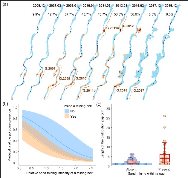 图3采砂对长江江豚分布的影响。(a)长江江豚的分布位点(蓝点)和采砂区的空间关系,底图为相应年份长江江豚调查期间的水域矢量图。(b)长江江豚分布概率与最近采砂带相对采砂强度之间的关系。(c)采砂存在/不存在时,长江江豚分布空白的长度
