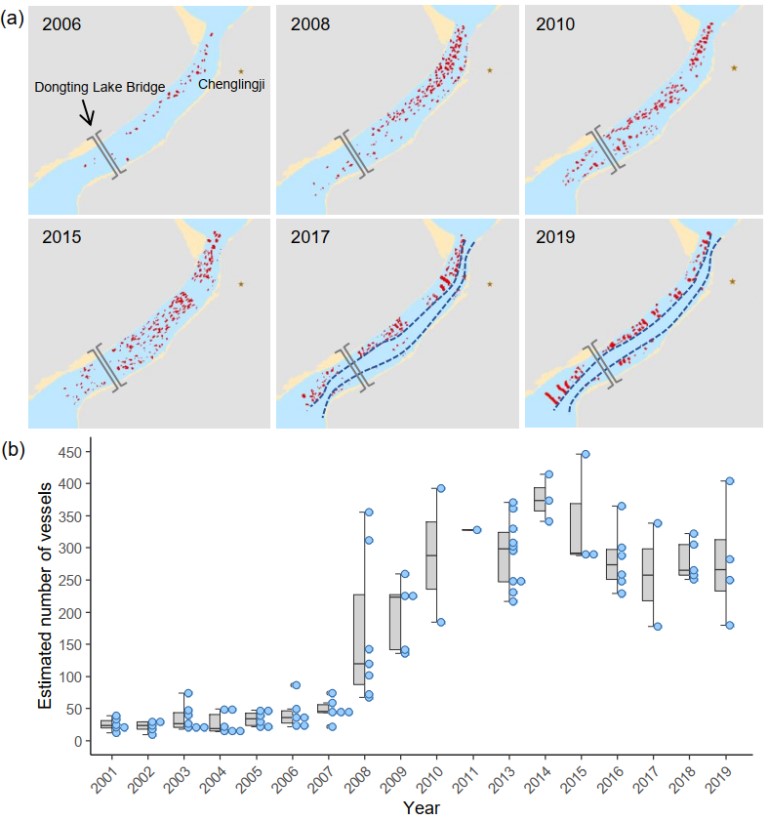 图4洞庭湖城陵矶通江水道上的运砂船数量及分布(a)当年份采砂船数量最多的影像。蓝色虚线为自2017年中期停止采砂以来预留的长江江豚通道。(b)运砂船的数量估计