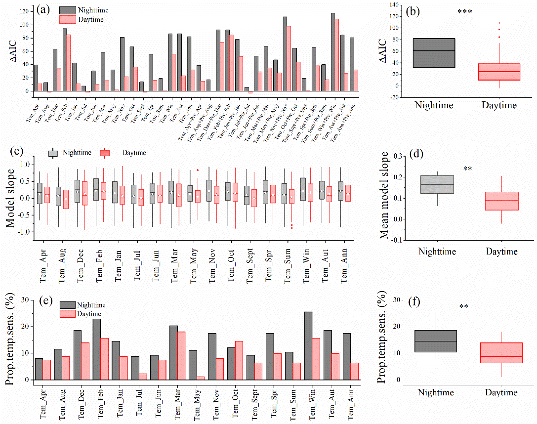 中国科学院武汉植物园助理研究员史航在张全发研究员和党海山研究员的指导下,通过在全球范围内收集和整理高山林线的更新数据,并结合本课题组的野外数据,运用整合分析的方法比较了北半球林线更新对白天和夜间升温的响应,并评估了降雨对林线更新的影响。结果表明,不管处于何种环境条件之下,白天和夜间的升温都能显著促进林线的更新。然而,相比于白天温度,林线更新对夜间温度的变化更为敏感。这一现象主要是由于在全球变暖的背景下,白天温度的升高更容易导致干旱情况的发生。因此,鉴于当前全球地表温度将继续上升,我们需要更多的关注这种白天和夜间变暖对陆地生态系统的不对称影响,以制定有效的策略来应对未来全球气候变化对山地森林生态系统的影响。