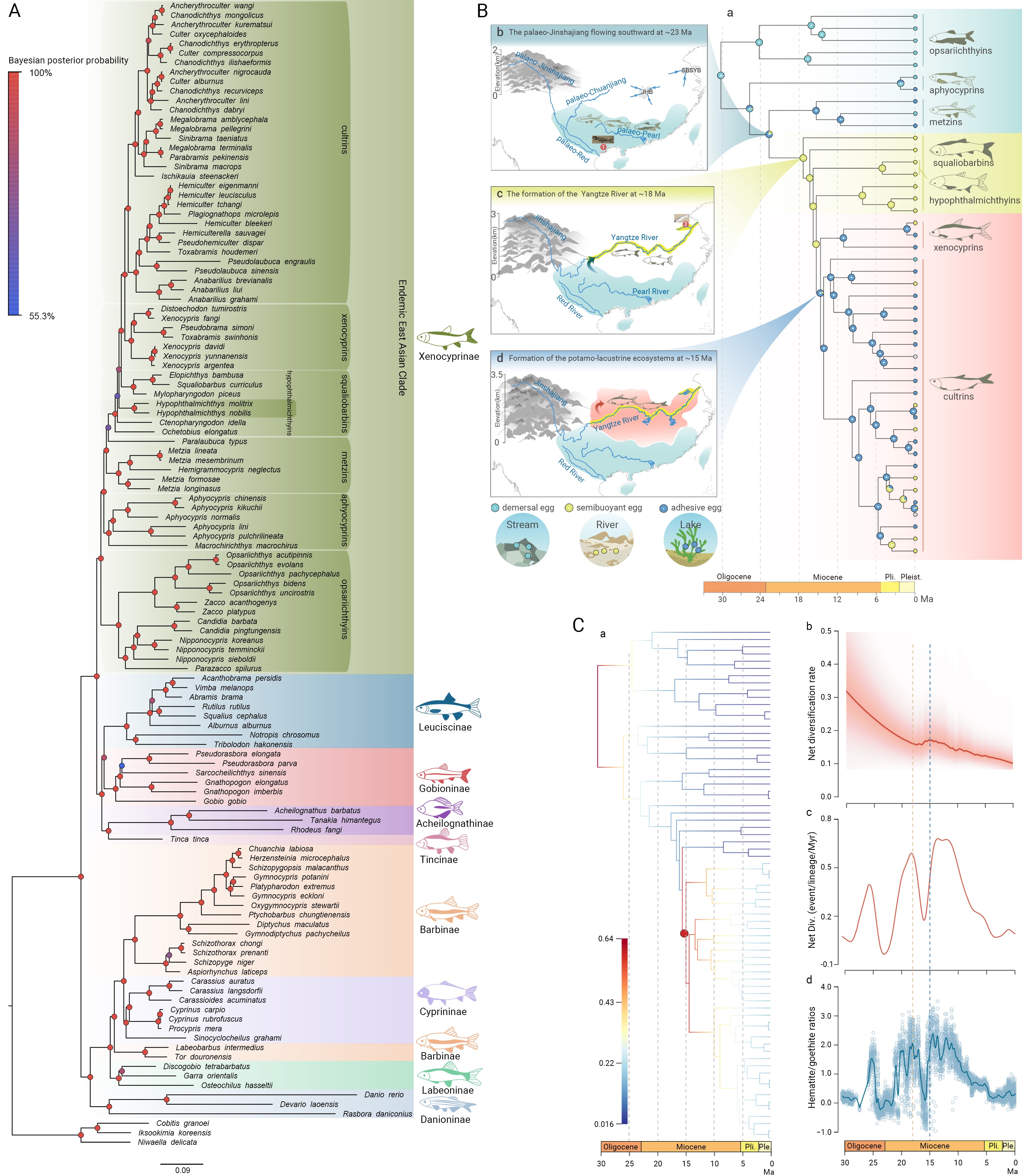 河流的地貌过程在很大程度上促进了淡水鱼类的多样性演化,反过来,重建淡水鱼类的系统地理动态亦可对河流系统的时空演变进行重演,这正在日益成为一个科学共识。鲤科鱼类东亚特有类群由青藏高原隆升期间强烈的东亚季风影响下演化而来,并适应了这独特的气候和水文条件。在这一特有支系中,一些底栖产卵鱼类产粘性卵或沉性卵,而另一些河流产卵鱼类则产漂流性卵。漂流性卵被认为是东亚鲤科鱼类在季风气候及大河环境中生存的关键特征。
