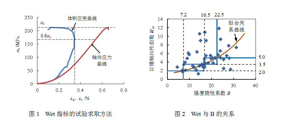 (2)针对硬岩体,从活跃性和剧烈性两个角度给出了岩石岩爆倾向性的定义,系统总结归纳了现有岩石岩爆倾向性评价指标,提出了岩爆倾向性指标Wet的试验求取方法(图1),建立了Wet与脆性指数B的定量关系(图2),融合岩石岩爆倾向性、强度应力比两个因素,提出了潜在岩爆指数指标,给出了潜在岩爆灾害评估工作流程和地应力水平评价标准。