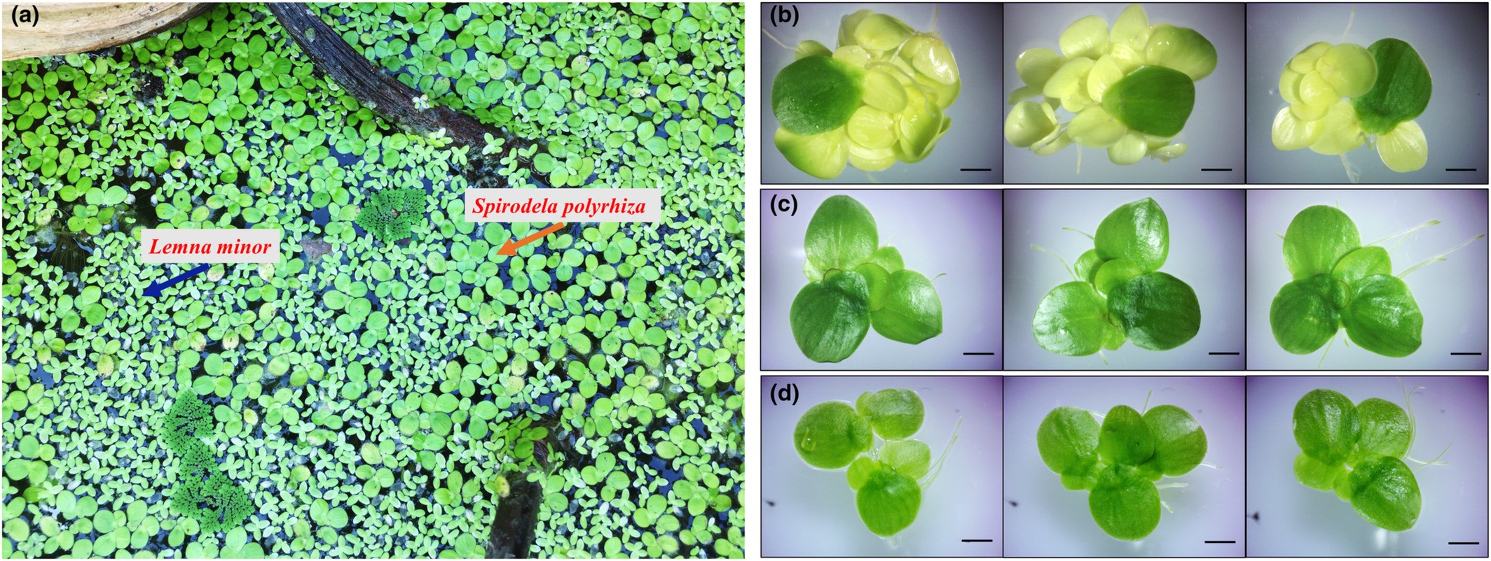 图1. 紫萍在不同营养条件下的表型。a,自然环境下的紫萍;b,异养;c,混合营养;d,自养