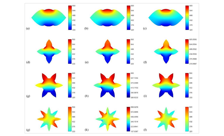 图1 在不同形状连续传热问题中的应用对比:积分-广义差分法IGFD(左)、广义差分法GFD(中)、有限元法FEM(右)