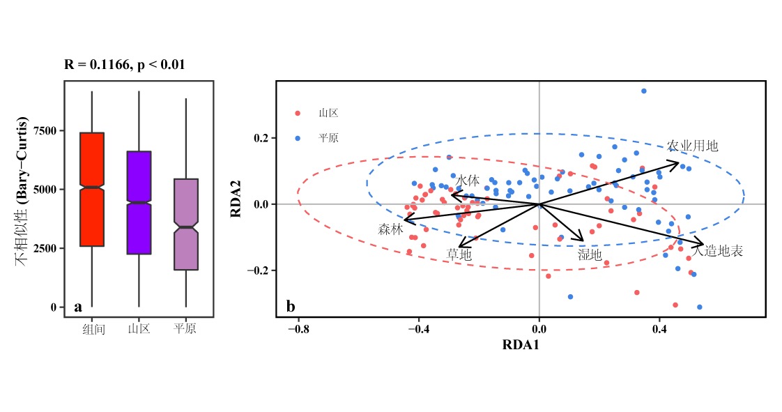前人的研究发现,在大空间尺度上,“微塑料群落”的相似性随样点间的距离增加而显著降低。但在湖北省和祁连山的两项研究中,空间距离都没有表现出与“微塑料群落”相似性距离间的强相关性。在湖北省的研究中,以土地利用计算的环境距离显著降低了“微塑料群落”的相似性;而在祁连山的研究中,没有任何环境距离指标表现出了对“微塑料群落”相似性的影响。