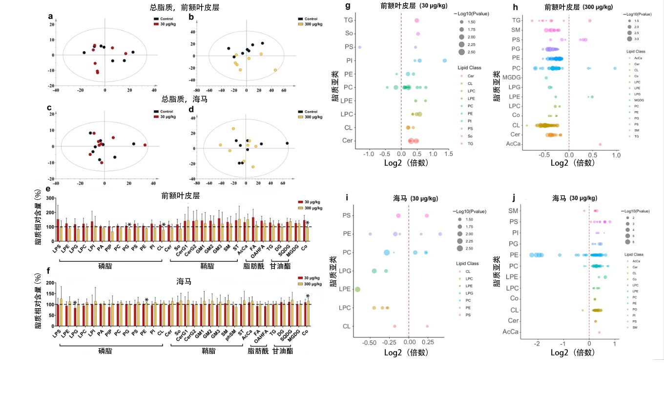 图1. MC-LR对小鼠海马和前额叶皮层脂质侧面的影响。(a-d)MC-LR处理组和对照组总体脂质分布模式的主成分分析图;(e-f)海马和前额叶皮层中MC-LR处理组各脂质亚类含量变化;(g-j)海马和前额叶皮层中MC-LR处理组脂质分子含量变化