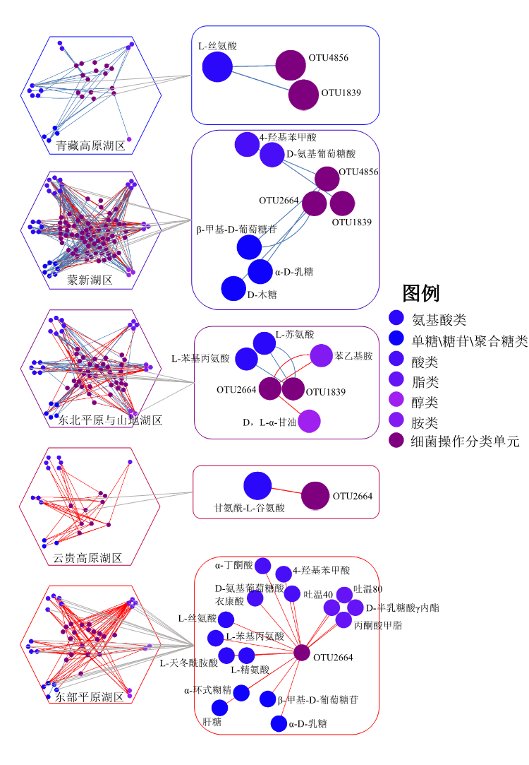 研究发现温暖湖区通常比寒冷湖区有更低的碳浓度和更高的碳利用效率,同时发现温暖湖区中的蓝藻门(Cyanobacteria)和放线菌门(Actinobacteriota)的丰度更高,但变形菌门(Proteobacteria)的丰度却更低。这是因为随着温度升高,微生物网络中的核心物种会相应变化,从能抑制氨基酸和糖类碳利用的氢杆菌属(Hydrogenophaga)和红杆菌科(Rhodobacteraceae)转变成能促进几乎所有碳利用的菌属CL500-29-marine-group,从而使得温暖湖区中的微生物群落大量利用碳物质。该研究结果表明,中国五大湖区的温度梯度能够驱动微生物群落组成的改变进而规律性调节湖泊微生物的碳利用,这预示着在气候变暖的条件下,微生物可能会降低湖泊的碳封存能力。