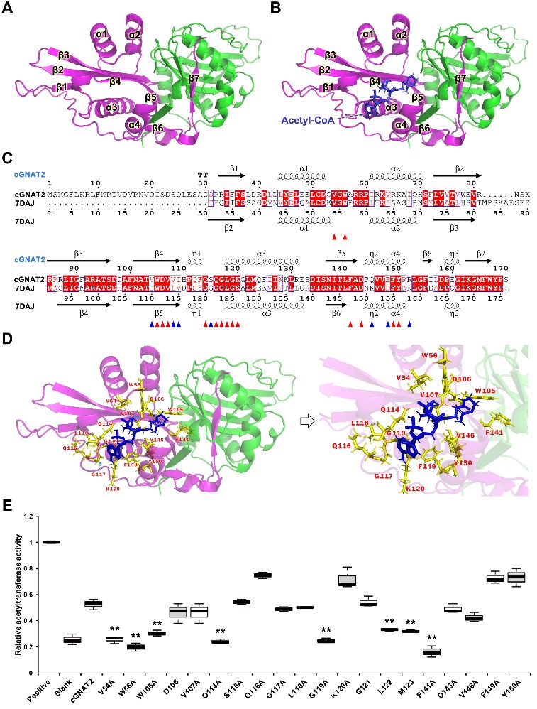 为了阐明cGNAT2潜在的催化机制,该团队利用AlphaFold2预测了cGNAT2的结构,发现该蛋白是一个同源二聚体的结构,由7个 折叠和4个 螺旋结构组成,形成一个管状口袋,能够与底物蛋白以及Acetyl-COA结合进而发挥催化作用;通过分子对接进一步确定了cGNAT2与Acetyl-COA之间的结合区域,并结合位点突变与体外酶活性实验证实了有8个氨基酸残基是维持酶活性的关键位点(图2)。