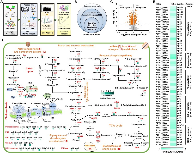 为了揭示cGNAT2的分子作用机制,通过采用乙酰化抗体富集和非标记定量乙酰组学技术,系统鉴定到548个cGNAT2调控的内源性靶标修饰蛋白,这些蛋白广泛分布于光合作用以及能量代谢通路中,表明cGNAT2调控的乙酰化修饰在光合系统以及能量代谢等生物学过程中发挥着重要的调控作用(图3)。