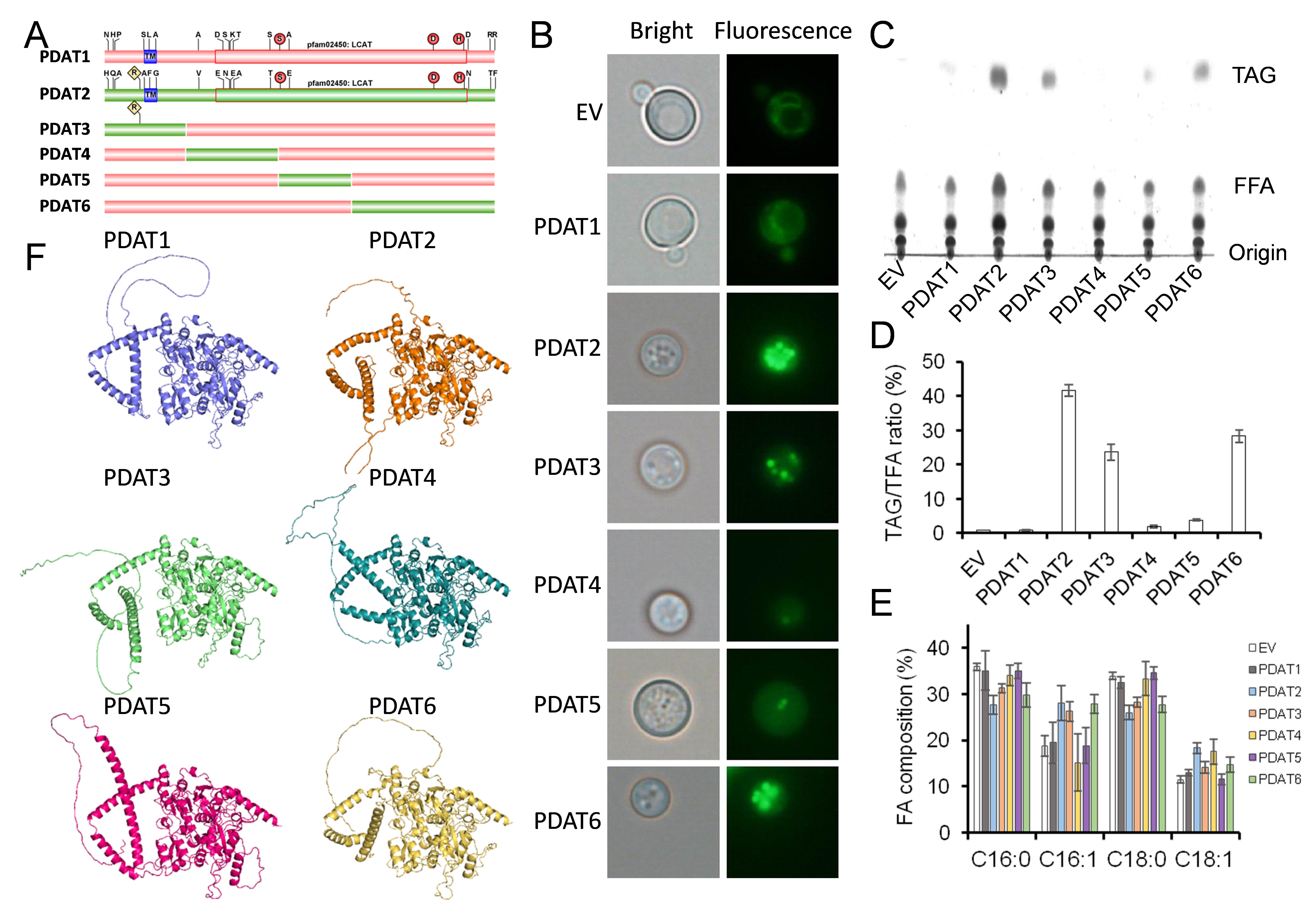 酵母中异源表达分析显示,等位基因 PDAT Allele 2编码的氨基酸有TAG合成的活性,而等位基因 PDAT Allele 1编码的氨基酸几乎没有TAG合成的活性,N端的7个和C端的3个氨基酸变异对二者的活性有显著影响(图3)。对PDAT基因敲除藻株进行脂质组分析,发现三角褐指藻PDAT主要以单半乳糖甘油二酯(MGDG)和磷脂酰胆碱(PC)作为酰基供体,这与其叶绿体最内层膜定位特性相符。该研究揭示了由等位基因编码的PDAT在介导碳储存和生长以应对氮胁迫方面的不平衡作用,并提出了提高脂质含量和生物量的基因工程新策略。