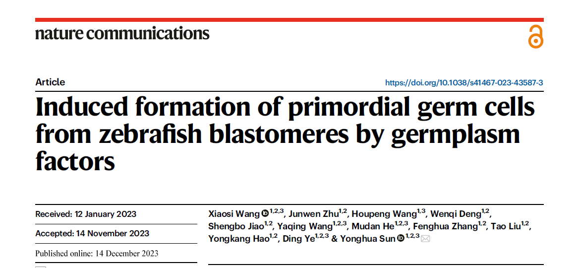 Wang, X., Zhu, J., Wang, H., Deng, W., Jiao, S., Wang, Y., He, M., Zhang, F., Liu, T., Hao, Y., Ye, D., and Sun, Y.* (2023). Induced formation of primordial germ cells from zebrafish blastomeres by germplasm factors. Nature Communications 10.1038/s41467-023-43587-3.