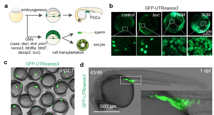 接下来,研究人员使用Tg(cmv:GFP)和Tg(cmv:mCherry)转基因胚胎分别作为iPGC移植的供体和受体。通过连续追踪iPGC移植性腺的发育,发现嵌合体性腺生殖细胞均表达GFP,性腺体细胞均表达mCherry。最终,利用表达mCherry的亲本产出了表达GFP的iPGC移植配子,其子代也能正常发育和繁殖。这表明,iPGC移植后能够正常发育为成熟的配子。为了进一步证明9个生殖质因子能够将任何一个胚胎细胞诱导为iPGC,作者尝试将9GM注射入128-细胞时期的斑马鱼胚胎的单个胚盘细胞中,发现无论注射到动物极,还是胚盘边缘的单胚盘细胞,9GM均能将该胚盘细胞诱导为iPGC,并进一步产生功能性配子,这表明9GM能够将任一胚盘细胞诱导成为iPGC。