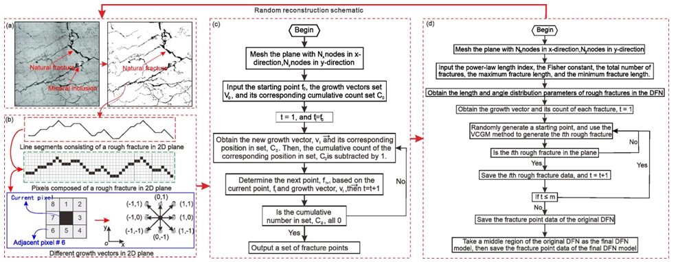 图1. 粗糙离散裂隙岩体重建示意图:(a)真实裂隙岩石及其处理后结果示意图;(b)向量统计原理;(c)基于方向向量的单粗糙裂缝重建流程示意图;(d)基于fisher分布和幂律分布及方向向量生长方法的随机离散裂缝网络重建流程示意图
