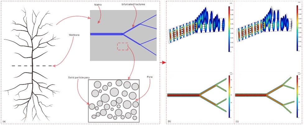 图3. 树状分叉裂缝中的流体流动示意图:(a)压裂后多尺度树状分叉裂缝示意图;(b)点-线型分叉裂缝中的流体流动云图;(c)点-圆型树状分叉裂缝中的流体流动云图