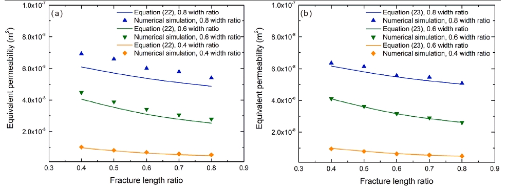 图4.不同树状裂缝网络的等效渗透率模型验证结果:(a)点-线型树状分叉裂缝网络;(b)点-圆型树状分叉裂缝网络