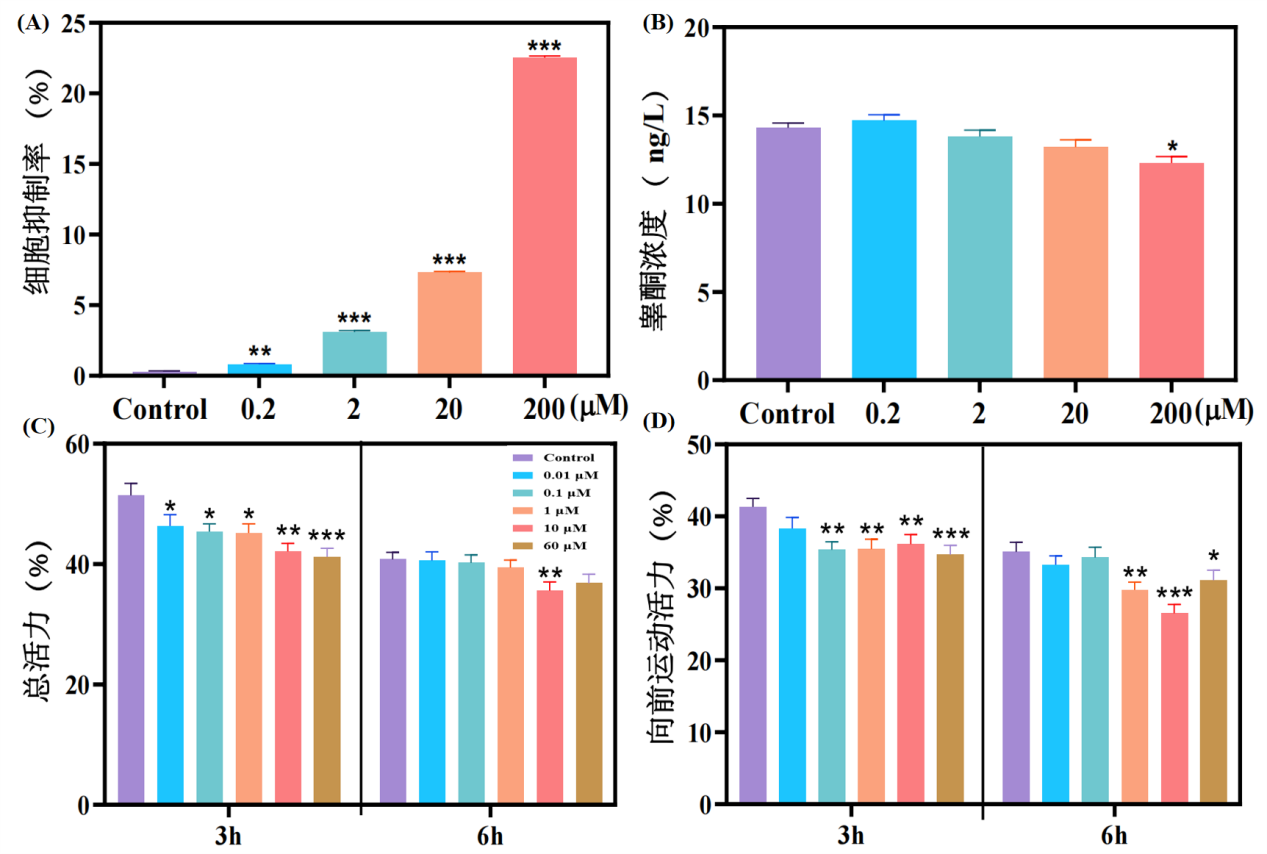 随后,研究人员通过离体暴露发现,TBPH可显著抑制Leydig 细胞的增殖以及细胞内雄激素的产生。将正常雄性斑马鱼的精子于体外暴露于TBPH之后,精子的总运动活力和向前运动活力均显著降低(图2)。上述结果证实,TBPH可以影响雄性生殖细胞的功能,降低精子的运动活力。