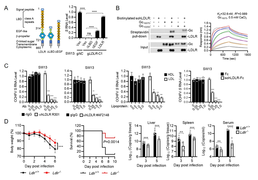 图1:LDLR是CCHFV的受体。A. 敲除LDLR显著抑制CCHFV的感染;B. LDLR与CCHFV的包膜蛋白Gc具有直接相互作用;C. LDLR的阻断抗体、LDL和可溶性LDLR均可显著抑制CCHFV的感染;D. LDLR基因敲除小鼠感染CCHFV后,体内病毒复制和致死率显著降低。