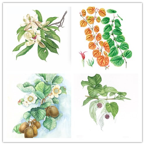 画家所绘湖北特色植物巴东木莲、连香树、中华猕猴桃、珙桐
