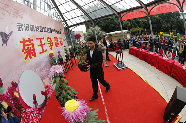 菊花精品展示区展示的菊花品种选自武汉植物园菊花生产保育基地,以及洪山区、汉阳区等12个区送展的菊花精品。武汉植物园菊花种质资源圃共收集菊花品种1200余种,涵盖了8大色系、5个瓣型和30个花型的品种。洪山区、汉阳区、东西湖区等区选送了100多个品种的800多盆菊花精品。