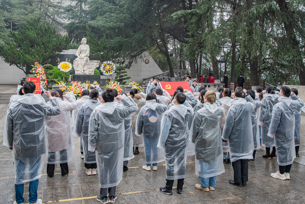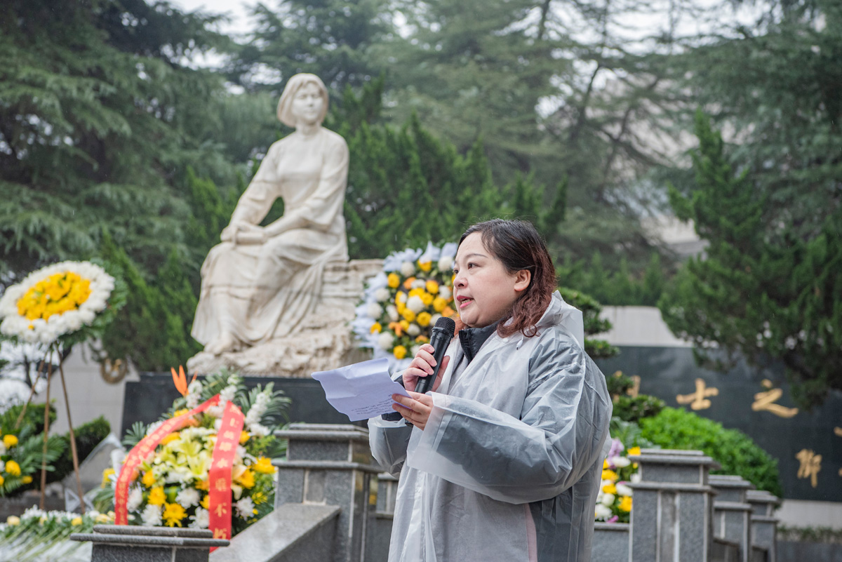 烟雨莽苍苍,鲜花祭英魂。上午10时,向巾帼烈士敬献花篮仪式正式开始。在所党委委员、中心党支部书记孙修炼和所妇委会主任、中心主任邓菲的带领下,全体人员手持清菊,面向向警予烈士纪念碑肃立,高唱国歌。随后,青年代表稳稳抬起花篮,缓缓走向向警予雕像,端正摆放于雕像基座上。孙修炼和邓菲走向雕像基座,在花篮前驻足凝视,仔细整理花篮缎带。全体人员深深三鞠躬,默哀一分钟,深切表达对烈士的怀念和崇敬之情。在烈士雕像前,面向党旗,孙修炼带领党员们重温入党誓词,“随时准备为党和人民牺牲一切”,激昂的声音在广场回荡,这是对烈士英魂的告慰,更是再一次作出自己对党的庄严承诺。