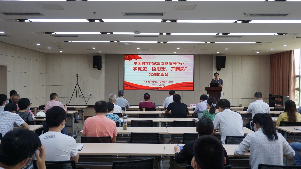 6月28日,中国科学院武汉文献情报中心举行党史学习教育专题党课报告会,在职党员、学生党员及离退休党员代表等70余人参加。会议由党委副书记、纪委书记刘德洪主持。