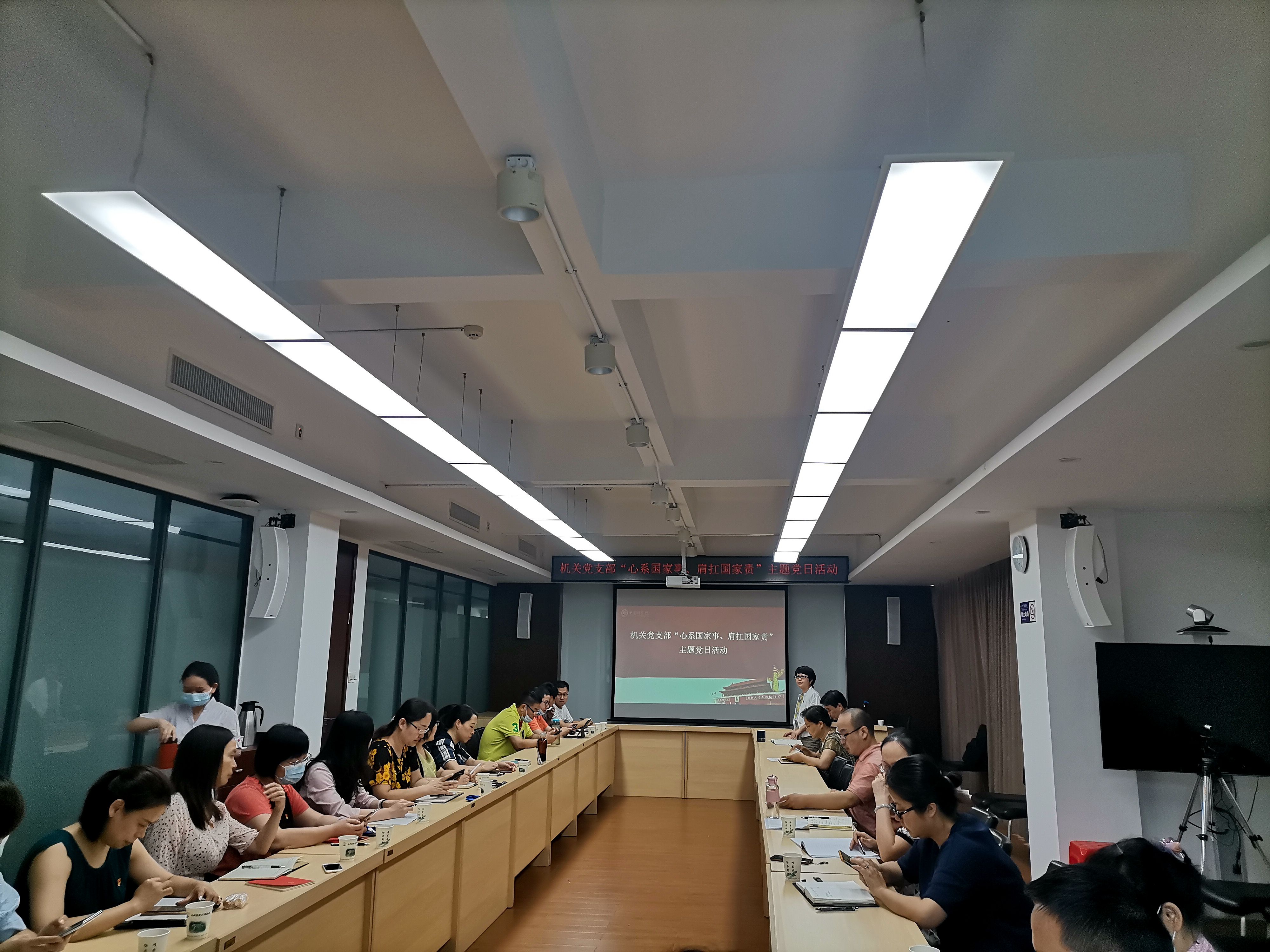 机关第一支部书记陈艳主持并传达了中科院党组2021年夏季扩大会议精神,带领与会党员深刻领会“国家事”、“国家责”的内涵与要求:“国家事”、“国家责”必须充分体现国家意志、有效满足国家需求、代表国家最高水平。会议对“如何结合管理工作勇挑‘国家责’”进行了深入交流与讨论,机关第一党支部党员王豫兰分享了多年科研管理工作的管理经验,她指出“管理工作要切实为科研人员服务,我们多做点科研人员就轻松点”。机关第二党支部党员夏朗表示,作为一名基层的后勤保障工作者,要从单位的整体利益出发,脚踏实地做实事,不断提高服务水平和工作效率,肩扛“国家责”就是要提高管理能力和水平,为科研中心工作尽好责、服好务。其他与会党员也结合自身工作,分享了心得体会。